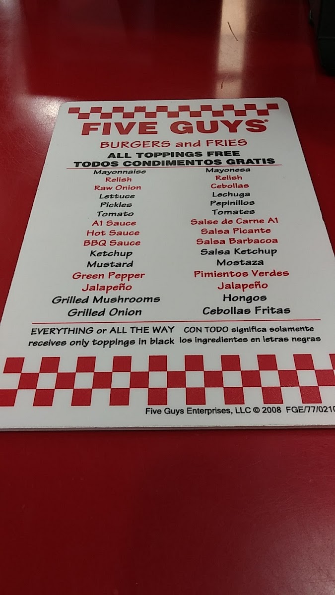 Five Guys offers a standout fast-food experience with its fresh, hand-formed hamburger patties grilled to perfection and served on soft, toasted sesame seed buns. The menu centers around customizable burgers—whether a classic hamburger, a cheeseburger layered with American cheese, or a savory bacon burger with crispy applewood-smoked bacon. Customers can pile on as many fresh toppings as they desire, creating a truly personalized meal.